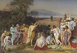 В качестве пенсионера Общества поощрения художников (ОПХ) Александр Иванов в 1830 году уехал в Италию, с 1831 года жил и работал в Риме. Известно, что в 1833 году у него уже появилась идея создания монументального многофигурного полотна на тему «Явления Мессии народу»[6][7][8]. В письме в Общество поощрения художников, отправленном в начале 1833 года, Иванов сообщал, что при изучении Евангелия от Иоанна он понял «сущность всего Евангелия» — он увидел, что «Иоанну Крестителю поручено было Богом приуготовить народ к принятию учения Мессии, а, наконец, и лично представить его народу!» Далее художник писал, что «сей-то последний момент выбираю я предметом картины моей…»[24]