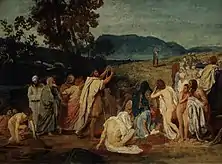 В апреле 1838 года Иванов послал в Санкт-Петербург рисунок с картины. Рисунок был одобрен ОПХ, которое назначило художнику денежное пособие на 1839 год, предложив закончить работу над полотном к 1840 году. В июне того же года Иванов получил письмо от отца, в котором тот, наряду со своими замечаниями, передал сыну комментарии искусствоведа Василия Григоровича: «…фигуры на втором плане на правой стороне рисунка расположены квадратно, чему весьма легко пособить можно, по моему мнению, возвысив из них некоторые, т. е. посадить на лошадей воинов, чем эта группа и разыграется»[32].