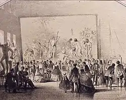 Затем началась подготовка к демонстрации полотна в Академии художеств. 3 июня 1858 года[K 2] Иванов побывал в здании Академии и осмотрел возможные помещения для экспозиции, сочтя наиболее подходящей Античную залу[12]. Картина была перемещена туда из Зимнего дворца 9 июня, вместе с ней были выставлены эскизы и этюды[12][87][88]. Выставка произведений Иванова началась 10 июня[13]. 12 июня в газетах появилось следующее сообщение: «От Императорской Академии художеств объявляется, что написанная в Риме г. Академиком ИАХ Ивановым картина „Явление Мессии народу“ выставлена в Академии и желающие могут видеть её ежедневно с 12 до 3-х часов по полудни»[72]. На бесплатной экспозиции побывало более 30 тысяч человек[88].