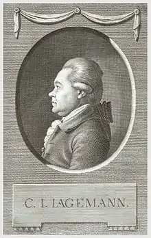 ![]() Христиан Ягеманн (1735–1804), известный немецкий историк литературы. Гравюра, 1790 | |