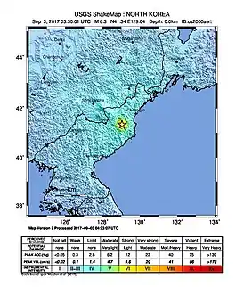 3 сентября 2017 года Северная Корея провела шестое ядерное испытание. Первой об этом событии сообщила Корейская метеорологическая администрация[1]. Министерство иностранных дел Японии также пришло к выводу, что Северная Корея провела ядерное испытание[2]. Геологическая служба США сообщила о землетрясении в 6,3 баллов, недалеко от северокорейского ядерного полигона Пунгери[3]. Южнокорейские органы власти заявили, что по их мнению землетрясение было искусственным — спровоцированным ядерным испытанием. Геологическая служба США, как и Центр сетей по вопросам сейсмологии Китая, сообщила, что через несколько минут после первого происшествия на том же месте произошло второе, меньшее, землетрясение, которое охарактеризовалось обрушением полости[уточнить][4][5].