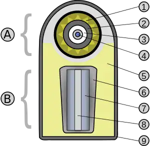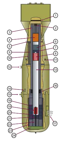 - источника питания (часто его называют источником тока) длительного хранения (последнее означает, что при хранении источник питания неактивен и приводится в действие лишь при запуске ядерного боеприпаса),