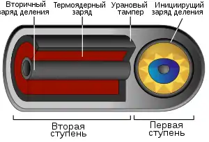 В двухфазном ядерном взрывном устройстве первая стадия физического процесса (primary) используется для запуска второй стадии (secondary), в ходе которой и выделяется наибольшая часть энергии. Такую схему принято называть конструкцией Теллера — Улама.