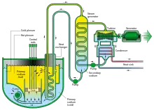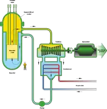 Сверхкритический водяной реакторen (SCWR)[16] представляет собой водяной реактор со сниженным замедлениемen, который из-за относительно высокой средней скорости нейтронов называют надтепловым. В качестве рабочей жидкости используется вода в сверхкритическом состоянии. SCWR — это в основном легководные реакторы (LWR), работающие при более высоких давлениях и температурах с прямым прямоточным циклом теплообмена. Как предполагается, он будет работать в прямом цикле, во многом подобно реактору с кипящей водой (BWR), но поскольку он использует сверхкритическую воду в качестве рабочего тела, он будет иметь только одну водную фазу, что делает метод сверхкритического теплообмена более похожим на реактор с водой под давлением (ВВР). Он может работать при гораздо более высоких температурах, чем существующие ВВР и BWR.