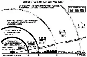 Взрыв мощностью 20 кт даёт зону полных разрушений радиусом около 1 км, 20 Мт — уже 10 км. По расчётам, при взрыве мощностью 100 Мт зона полного разрушения будет иметь радиус около 35 км, сильных разрушений — около 50 км, на расстоянии около 80 км незащищённые люди получат ожоги третьей степени. Практически одним таким взрывом может быть полностью уничтожен любой из самых крупных городов Земли.