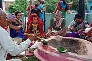 Первоначально огонь берётся из дома отца. Когда сын и его новообразованная семья выделяется в самостоятельное домохозяйство, огонь впервые зажигается во время свадьбы. Затем в ходе жертвоприношения огонь разделяется на два пламени. Одно из них становится родовым (семейным), называемым «грихья-агни». Другое считается общинным и предназначенным для жертвоприношений, его называют «шраута-агни». Если семейный огонь служит для приготовления пищи, то общинный огонь используется для ритуалов. Оба огня поддерживаются на протяжении всей жизни человека[24]. Без непрерывного поддержания огня горючий материал поджигается при помощи вязанки сухой травы куша[25].