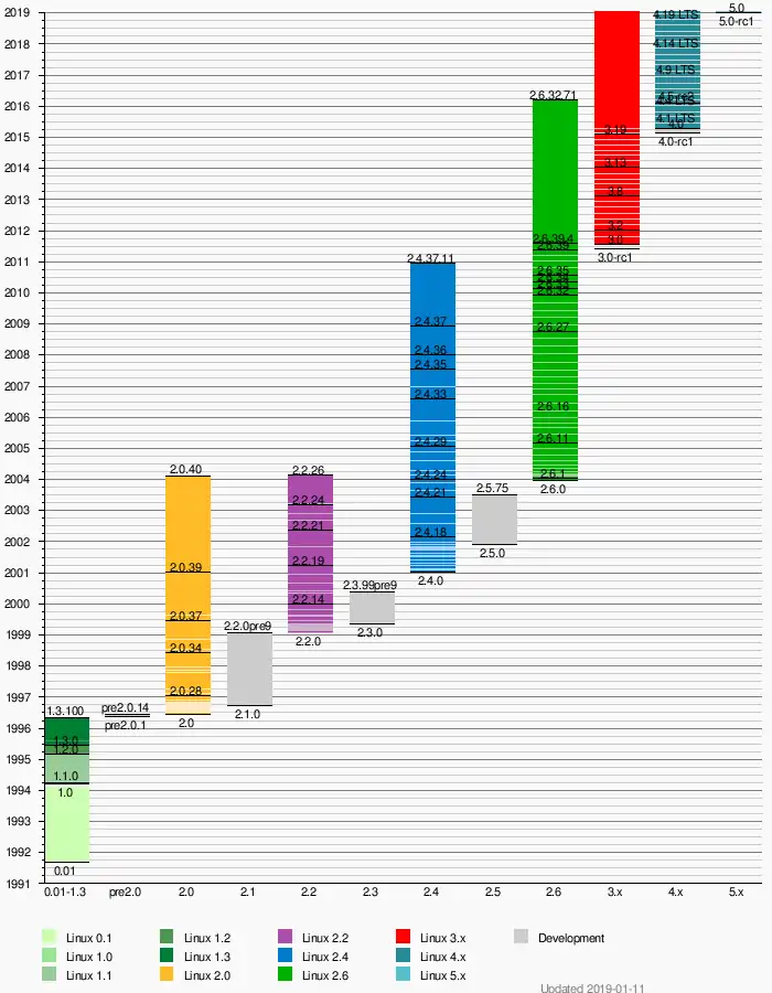 - 7 января 2019: первый релиз-кандидат Linux 5.0 (более 26 млн строк кода).