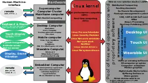 Большинство мобильных устройств, таких, как смартфоны и планшетные компьютеры на базе операционных систем Android, MeeGo, Tizen, а также телевизоры и многие служебные устройства, такие, как внешние сетевые жёсткие диски, маршрутизаторы и модемы, также использует операционные системы на базе ядра Linux.