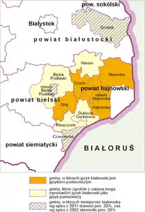 По состоянию на 17 марта 2014 года три языка меньшинств (белорусский, литовский и немецкий) и региональный кашубский язык законодательно приняты в качестве вспомогательного языка в 33 гминах[23]: