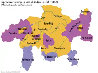 ![]() Официальные данные по языкам Граубюндена в 1860 году... | ![]() ...и в 2000-ом | ![]() Фактическая языковая ситуация в кантоне в 2000 году (с учётом немецко-ретороманского двуязычия) |