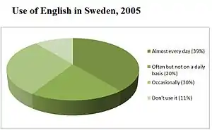 В шведских школах преподаются в основном такие иностранные языки, как английский, немецкий, французский, испанский, итальянский, норвежский и датский. После Второй мировой войны заметно возросла роль английского языка[8]. Некоторые лингвисты считают, что английский язык следует сделать вторым языком Швеции ввиду его распространённости[9]. Причиной этого является, в первую очередь, доминирование англоязычных программ на телевидении (все программы, кроме направленных на аудиторию младшего возраста, транслируются на языке оригинала, снабжаясь шведскими субтитрами). Однако на бытовом уровне английский практически не используется. Правительство страны активно поддерживает статус шведского языка; в частности, в 2002 году шведский был впервые официально объявлен государственным языком Швеции[10].