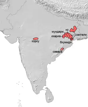 - кхервари: индийские штаты Бихар и Орисса: сантали, свыше 4 млн человек, мундари, около 750 000 человек, хо 400 000 человек, и около десятка более мелких языков: корва, асури и др.