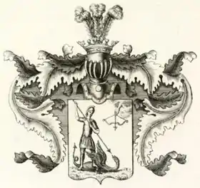 Описание герба: Выдержка из Общего гербовника В серебряном поле воин в латах и шишаке, поражающий копьем крылатого змия; в левом, верхнем, углу видна выходящая из облаков рука, которая пускает стрелу из натянутого лука |