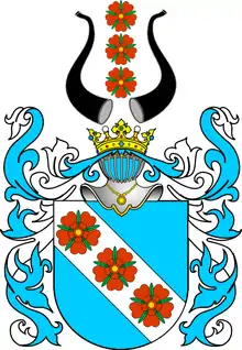 Щит увенчан дворянскими шлемом и короною, на поверхности которой перпендикулярно означена полоса с розами и по сторонам её два охотничьих рога. Намёт на щите голубой, подложенный серебром.