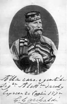 Впоследствии, в 1871 году, Александра Николаевна вновь отправилась в Италию, на этот раз на встречу с самим Гарибальди[31]. В ноябре она была в Турине у П. И. Якоби и его жены В. А. Якоби. У Луиджи Кастеллаццо она взяла письма к вождю и предполагала поехать к нему в сопровождении с сыном Гарибальди Риччотти. Но Гарибальди-младший заболел и долгое время не мог сопровождать Александру Николаевну в её путешествии, ей пришлось ехать одной. На острове Капрера Якоби оказалась лишь в июле 1872 года, когда смогла лично познакомиться с героем Италии, и гостила у него неделю. Она передала в подарок ему две красные рубашки из России и письма Кастеллаццо. Гарибальди подарил ей фотографию с автографом и передал через неё привет Н. И. Пирогову. Знаменитый хирург, по словам Гарибальди, спас революционеру жизнь[38].