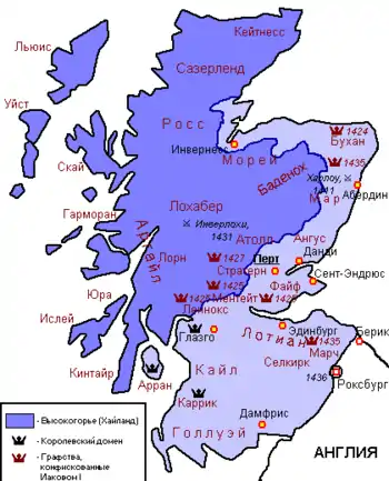 Крахом закончилась попытка короля установить контроль над шотландским высокогорьем: арест лидеров горских кланов в Инвернессе в 1428 году и последующее номинальное подчинение лорда Островов результата не принесли, а в 1431 году королевские войска под командованием Александра Стюарта, графа Мара, были наголову разбиты горцами в битве при Инверлохи. Антагонизм между горной и равнинной частями страны только углубился.