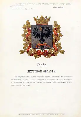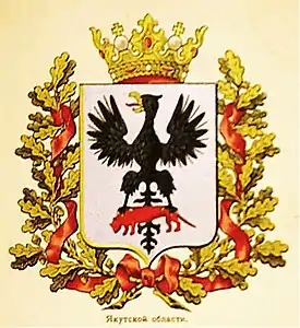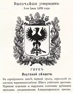 Герб Якутской области, созданный на основе переработки городского герба Якутска, был утверждён императором Александром II 5 июля 1878 года: «В серебряном щите, чёрный орёл, держащий в когтях червлёного соболя. Щит украшен Древнею Царскою короною и окружён золотыми дубовыми листьями, соединёнными Александровскою лентою».