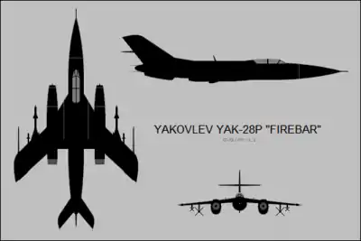 | Як-28П | («изд. 40», в войсках получил клички «Птеродактиль» и «Расчёска»; кодификация НАТО: Firebar). Истребитель-перехватчик с системами вооружения К-8М-1 и К-98. Самолёт строили в Новосибирске с 1962 года, испытания самолёта продолжались до 1965 года, производство завершено в 1967 году. Построено 435 машин. В процессе производства несколько раз подвергался изменениям и доработкам. Официально на вооружение не принимался. |