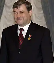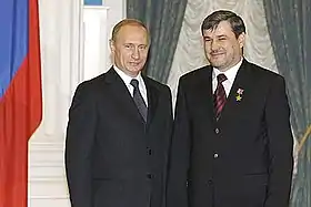 ![]() Руслан Ямадаев после вручения медали «Золотая звезда» Героя Российской Федерации в 2004 году. | |
