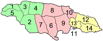 Ямайка разделена на четырнадцать приходов (округов) (англ. parish), которые располагаются в трёх исторических графствах.