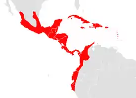 Ареал вида охватывает территорию следующих стран: Ангилья, Антигуа и Барбуда, Аруба, Багамы, Барбадос, Белиз, Колумбия, Куба, Доминика, Доминиканская Республика, Эквадор, Сальвадор, Гренада, Гваделупа, Гватемала, Республика Гаити, Гондурас, Ямайка, Мартиника, Мексика, Монтсеррат, Нидерландские Антильские острова, Никарагуа, Панама, Пуэрто-Рико, Сент-Китс и Невис, Сент-Люсия, Сент-Винсент и Гренадины, Тринидад и Тобаго, Британские Виргинские острова. Населяет вечнозелёные, тропические и сухие леса на высоте до 2300 метров над уровнем моря, а также сезонные незасушливые местообитания, изменённые человеком.