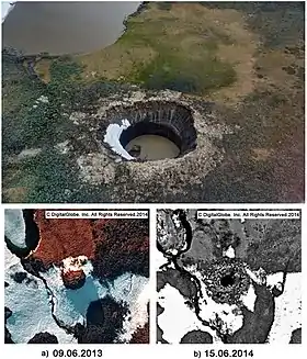 Ямальский кратер — округлое углубление на земной поверхности диаметром 20 м и глубиной более 50 м, образовавшееся в период с осени 2013 года по весну 2014 года в центральной части полуострова Ямал. Вокруг воронки расположен «бруствер» из выброшенных горных пород. Новообразованная воронка быстро заполнилась водой и уже к осени 2016 года превратилась в озеро[1].