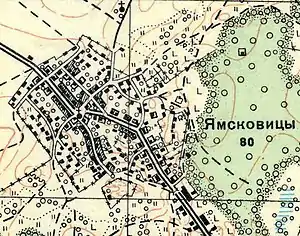 ЯМСКОВИЦЫ — деревня владельческая при колодцах, число дворов — 81, число жителей: 182 м. п., 201 ж. п.; Часовня православная. (1862 год)[15]