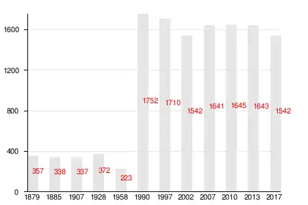 Число жителей по семейным спискам 1879 г.: 189 м п., 168 ж. п.; по приходским сведениям 1879 г.: 149 м п., 172 ж. п.[5]