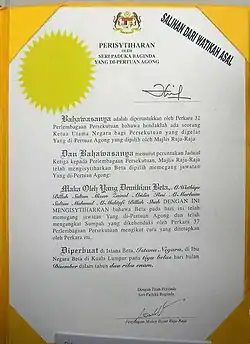 - Совет Правителей тайным голосованием решил, что по любой причине (например, по причине психического или физического расстройства) он не подходит на должность Янг ди-Пертуан Агонга.