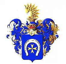 В лазоревом щите серебряная подкова шипами обращённая вниз. Внутри неё золотой мальтийский крест.