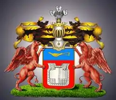 - Щит увенчан дворянскими шлемом и короной со страусовыми перьями. Намёт на щите золотой, подложенный чёрным. Щит держат два красных грифа.