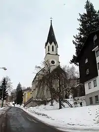 Расположен у подножия Чёрной Горы (1299 метров над уровнем моря) на окраине Крконошского национального парка. Город связан с вершиной горы канатной дорогой.