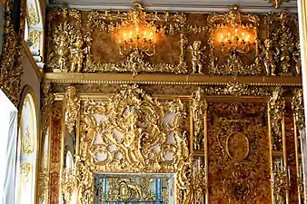Зеркало. Кёнигсберг. 1700—1705. Государственный Эрмитаж. Вместе с Янтарной комнатой было подарено Фридрихом Вильгельмом I Петру Великому в 1716 году.