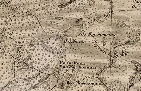 Берёт начало в болоте Машутинский Мох в виде нескольких ручьёв, впадающих в озеро Вороновское (Большое Вороновское). Из них два ручья на планах генерального межевания конца XVIII века обозначались как руч. Вороновщина и руч. Тереховской, а на картах XIX в. — как руч. Либа (протекает в среднем течении через небольшое озеро Глухое) и ручей Терехов Брод.