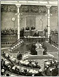 Проект Конституции Мэйдзи составлялся Ито Хиробуми (руководитель проекта), Иноуэ Каору, Ито Миёдзи, Канэко Кэнтаро, Карлом Фридрихом Германом Рейслером и Исааком Альбертом Моссе с 1883 по 1888 годы. В 1890 году Конституция вступила в силу. Согласно Конституции, Япония получала официальное название — «Великая Японская Империя»[12]; в стране устанавливалась конституционная монархия прусского образца. Роль ряда важных институтов — таких, как гэнро и Тайный Совет — не была чётко прописана в Конституции. В целом, Конституция могла быть интерпретирована как в стороны большего либерализма, так и большего авторитаризма.