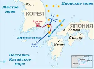 На начальном этапе войны для японской стороны важнейшей задачей было установить контроль над Корейским проливом, чтобы перебросить свои войска на материк и обеспечить их всем необходимым для ведения боевых действий. Эту задачу ей удалось выполнить 13 апреля, когда было нанесено поражение российскому флоту на подходе к Порт-Артуру, после чего русская эскадра оказалась запертой в Порт-Артуре. Это позволило Японии перебросить свои войска в Корею, захватить Сеул и выйти к реке Ялу. 29 апреля — 1 мая японцы нанесли первое поражение русской армии (Тюренченский бой). Затем 1-я японская армия, перейдя реку Ялу, быстро двинулась на юг Маньчжурии. В это же время 2-я армия была высажена на Ляодунский полуостров. Несколькими днями позже 3-я армия окружила Порт-Артур и начала его осаду. Попытка эскадры, запертой в Порт-Артуре, 10 августа прорвать блокаду была неудачной. 29-августа — 3 сентября 1904 года русским войскам было нанесено поражение при Ляояне, после чего они отступили к Мукдену. 2 января 1905 года пал Порт-Артур, а позднее, 10 марта 1905 года, русская армия потерпела поражение в решающем сражении под Мукденом. Разгром эскадры адмирала Рожественского японским флотом под командованием адмирала Того в Цусимском проливе 27 мая 1905 года довершил военную катастрофу России.