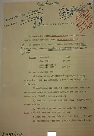 В Государственном архиве РФ был обнаружен документ МВД СССР особой важности — «Справка о количестве военнопленных бывшей японской армии, взятых в плен советскими войсками в 1945 году»[8], направленная 18 октября 1956 года, накануне подписания Советско-японской совместной декларации о восстановлении дипломатических и консульских отношений по запросу советского внешнеполитического ведомства, в адрес Н. С. Хрущёва, Н. А. Булганина и А. И. Микояна. В ней впервые были представлены отличные от общепринятых ранее данные по японским военнопленным.