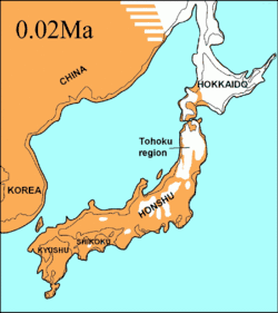Японский архипелаг в во время последнего ледникового максимума около 20 000 лет назад, тонкая черная линия выделяет современные береговые линии