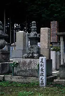 Наиболее распространенная форма захоронения в Японии — это семейные могилы. Помимо каменного монумента, они включают в себя место для цветов, фимиам, воду перед монументом и крипту для праха. Дата возведения могилы и имя человека, купившего её, может быть выгравировано сбоку на монументе. Имена покойных зачастую, но не всегда, наносят на переднюю часть памятника. Если один из супругов умирает раньше второго, то имя живущего может быть также выгравировано на надгробии, но иероглифами красного цвета, который означает, что он еще жив. После его смерти и захоронения красные чернила смываются. Так делается из финансовых соображений, потому что выгравировать два имени за один раз дешевле, чем заказывать нанесение второго имени, когда человек умрёт. Однако это менее популярная практика в наши дни[обтекаемое выражение]. Имена покойных могут быть также выгравированы на левой стороне монумента или на отдельном камне перед ним. Зачастую имена пишут на отдельной деревянной доске сотоба (яп. 卒塔婆), которая устанавливается позади или сбоку от монумента. Эти дощечки могут сделать практически сразу после смерти, а также ко дню похоронной службы.
