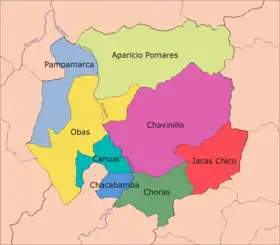 Районы Чакабамба, Кауак, Обас и Пампамарка расположены на западном берегу реки Мараньон, в то время как районы Хорас, Чавинильо, Хакас Чико и Апарисио Помарес находятся на восточном берегу упомянутой реки. Восточная часть района Обас расположена на части восточного берега, а район Хакаса Чико — на части восточного фланга Центральной Кордильеры, выходящей к реке Хуаллага. Эта характеристика повторяется, когда Мараньон направляется на северо-запад, входя в провинцию Уамальес, после пересечения соседней провинции Дос-де-Майо.