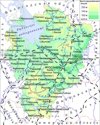 Площадь Ярославской области составляет 36,2 тыс. км². Из этого 17,2 тыс. занимают леса, 11,3 тыс. сельхозугодья, 3,9 тыс. водные объекты, 1,1 тыс. болота, прочие земли — 2,7 тыс. км². Протяжённость с севера на юг — 270, с запада на восток — 220 км. Самая высокая точка — возвышенность Тархов холм на севере Переславского района: 292,4 м над уровнем моря. Самая низкая точка — дно реки Волги в месте её истечения из Ярославской области в Костромскую — 75 м над уровнем моря (отметка уреза воды около 84 м над уровнем моря)[6].