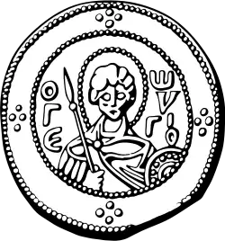 ![]() Печать князя Ярослава Владимировича, найденная на Троицком раскопе в Новгороде в 1994 году[2] | |
