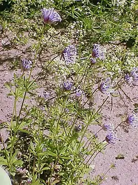 Цветки собраны в головчатые соцветия, окружённые многочисленными ланцетовидно-линейными, шероховатыми листьями длиной 7—10 мм, шириной 1—1,5 мм. Венчик голубой, изредка белый, голый, длиной около 6 мм.