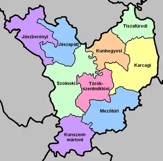 | Тёрёксентмиклошский район (венг. Törökszentmiklósi kistérség) | Тёрёксентмиклош | 499,58 | 38 837 | 8 |