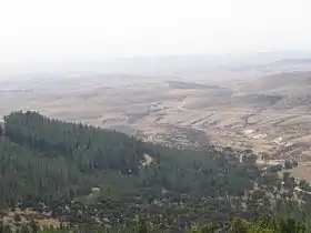 Слева — лес Ятир на спутниковой карте, справа — вид на лес Ятир со станции Beit Yaaranim. | ||||||||||