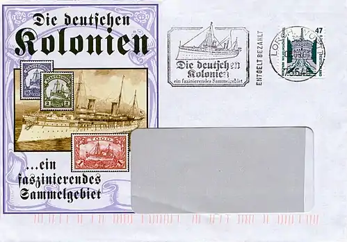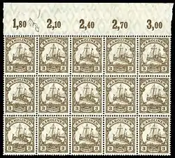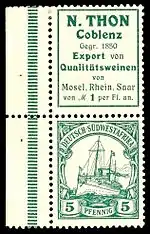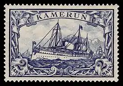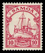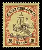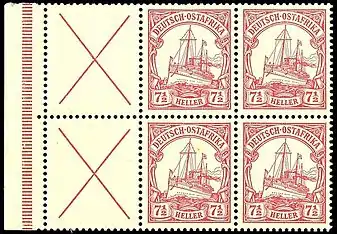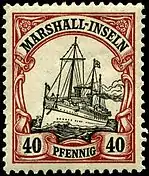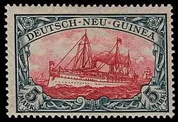 «Колониальная» часть серии (10 из 19 марок) повторяла основные черты серии «Яхта „Гогенцоллерн“» — в центре в овале рисунок этой яхты в сопровождении приспущенного знамени кайзерлихмарине. Марки печатались в листах по 20 штук (5 × 4)[36], а также наборами в виде оформленных в красно-чёрных имперских цветах перфорированных подарочных листков с пояснениями и реваншистскими призывами[32][34][37].