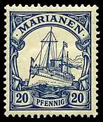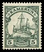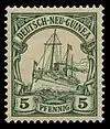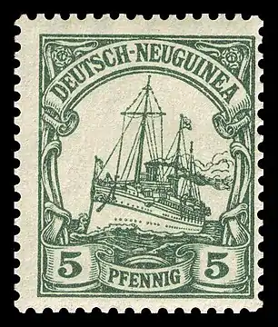 На рубеже 1900—1901 годов одновременно с выпуском в обращение в самой Германской империи новой серии стандартных почтовых марок «Германия» (нем. Germania) для всех её заморских колоний была издана первая серия оригинальных аналогичных марок с изображением кайзеровской яхты «Гогенцоллерн». Серия имела общий сюжет, но, как и «Германия», два отдельных дизайна для номиналов в пфеннигах (яхта анфас) и в рейхсмарках (яхта сбоку), причём цветовая гамма обеих серий («Германия» и «Яхта») гармонировала[6].