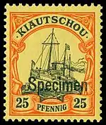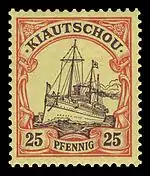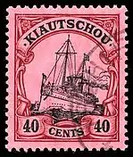 Отличалась и валюта концессионной территории Цзяо-Чжоу (Kiautschou) в Цинском Китае. В 1900 году для неё, как и для остальных колоний Германии, была выпущена серия «Яхта» в германской валюте (пфеннигах и рейхсмарках), однако с 1905 года её почтовые марки стали номинироваться в китайских долларах и центах (с 1907 года в долларах и центах Цзяо-Чжоу) — 1, 2, 4, 10, 20 и 40 центов, ½, 1, 1½ и 2½ доллара[6]. См. также: Германская почта в Китае.