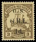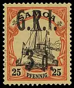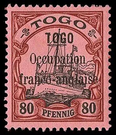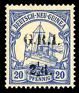 На Новой Гвинее, Маршалловых островах и Самоа «Яхта „Гогенцоллерн“» надпечатывалась аббревиатурой G.R.I. (лат. Georgius Rex Imperator, «Георг, король и император» — подпись Георга V), при этом часть тиражей надпечатывались для служебного использования (Official Service) — O.S. G.R.I. Камерунские надпечатки выглядели иначе — C.E.F. (англ. Cameroon Expeditionary Forces, «Экспедиционные силы в Камеруне»). В Того были выпущены в обращение «Яхты» без смены валюты с надпечатками по-английски TOGO Anglo-French Occupation для британской зоны оккупации и по-французски TOGO Occupation franco-anglaise для французской зоны[24][25]. Известны экземпляры с двойными, тройными, перевёрнутыми надпечатками, пропусками букв, ошибками в тексте и т. д[26].