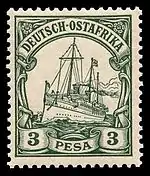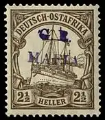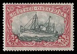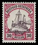 Колониальные власти приняли решение использовать корабельные «Германии» как служебные марки для франкировки посылок и бандеролей и распределили спасённый тираж (совокупно около 11 тыс. штук) по восьми крупнейшим почтовым отделениям Германской Восточной Африки. При этом номиналы серии «Германия» (в пфеннигах) были директивно переназначены в местной валюте, геллерах, следующим образом[17]: